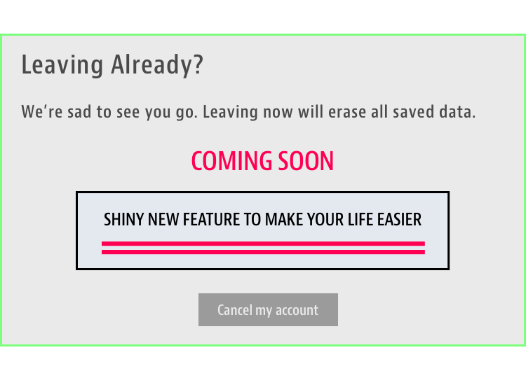 Customers sometimes cancel their subscriptions because you don’t have exactly what they’re looking for or because your product is missing key features they need. Adding a “Coming Soon” page during the cancellation process that lists the features you’re currently developing or are about to launch is an effective tool to convince those customers to stick around for longer.